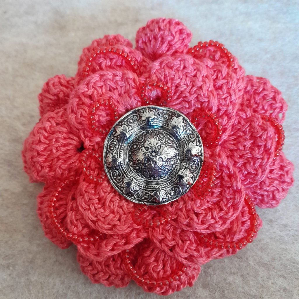 My flowers are made from bits and pieces of my hand spinning and dyeing from years gone by, or cotton that I’ve purchased, and accented with bead and buttons. I am getting considerable satisfaction from actually using stuff that has been stashed for years … many years … like, 20.