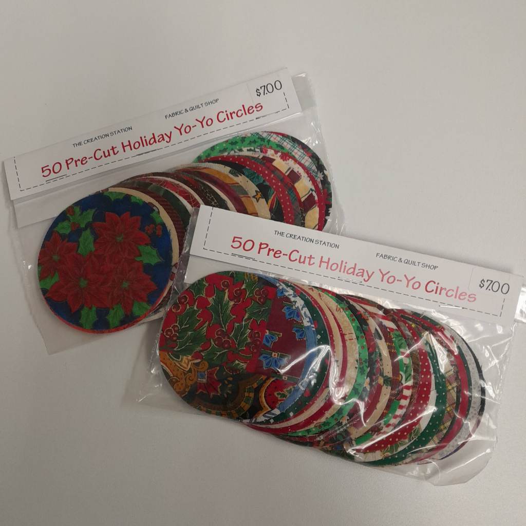 And, also, of course, I spent money. I got the cutest … hold on … I’m going to take a picture. These are packages of Christmas print cotton circles, of a three inch diameter, and out of these you make what are called in the quilting world, Yo-Yo’s. Now I have to make a yo-yo, and take a picture of that. Hold on …