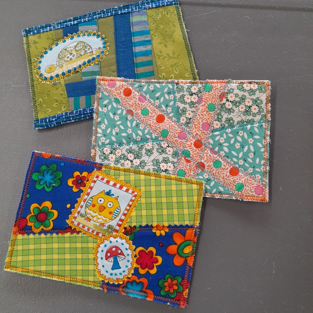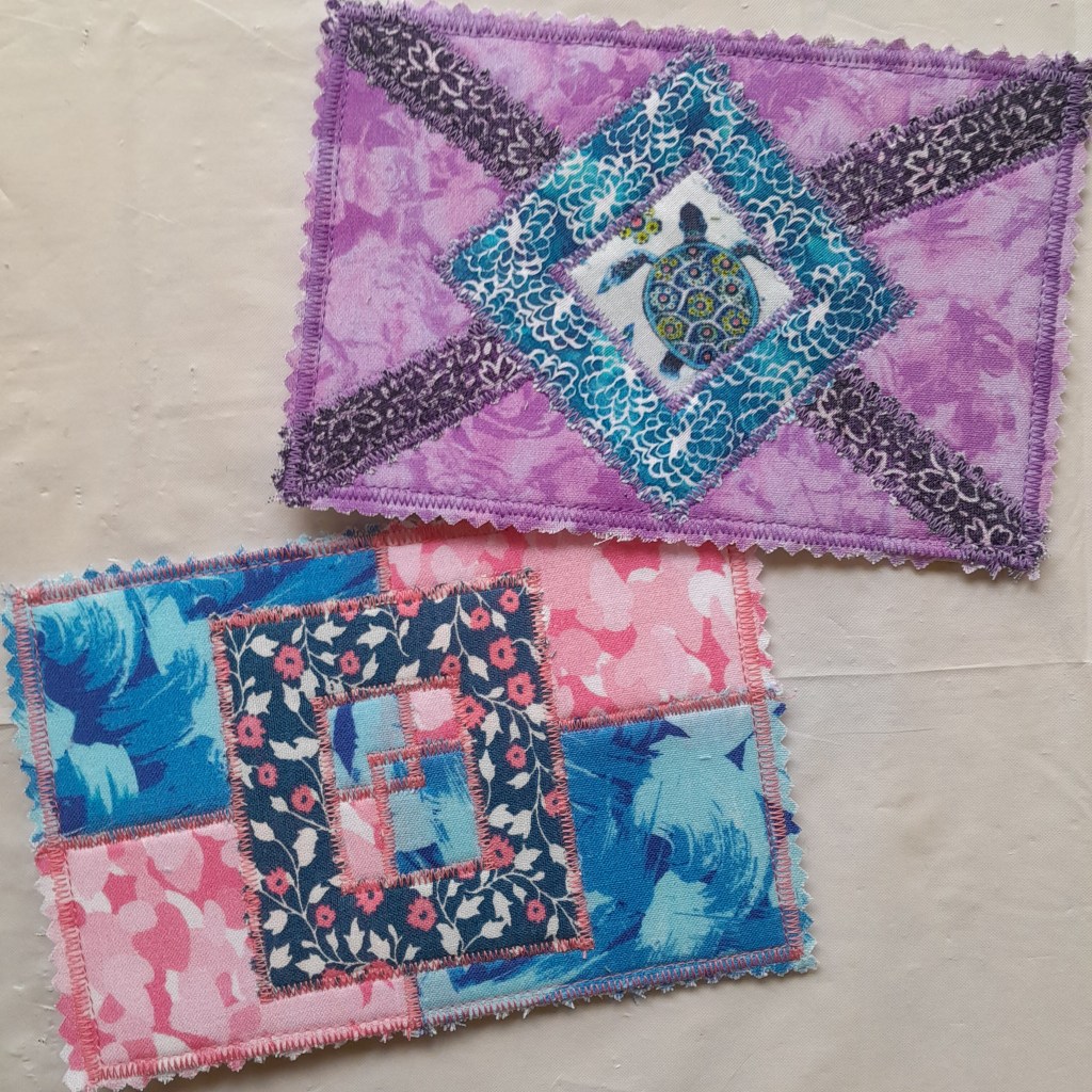 I have been volunteering with the East Bay Heritage Quilters: three more days since the quilt show in San Mateo mentioned in the October 18 post. First was the working party organized to produce the patchwork postcards that they sell at their quilt show, held every other year. I remembered to take a picture of three of the five that I turned in.