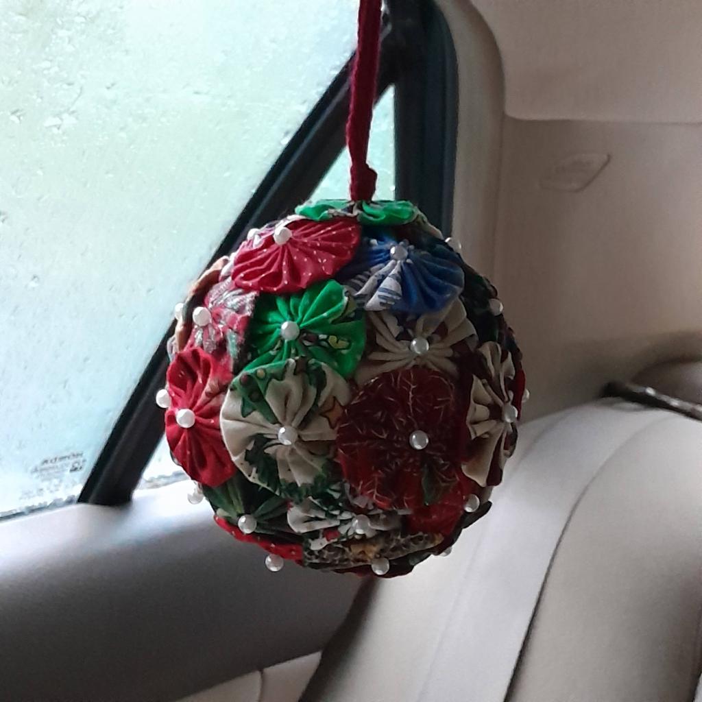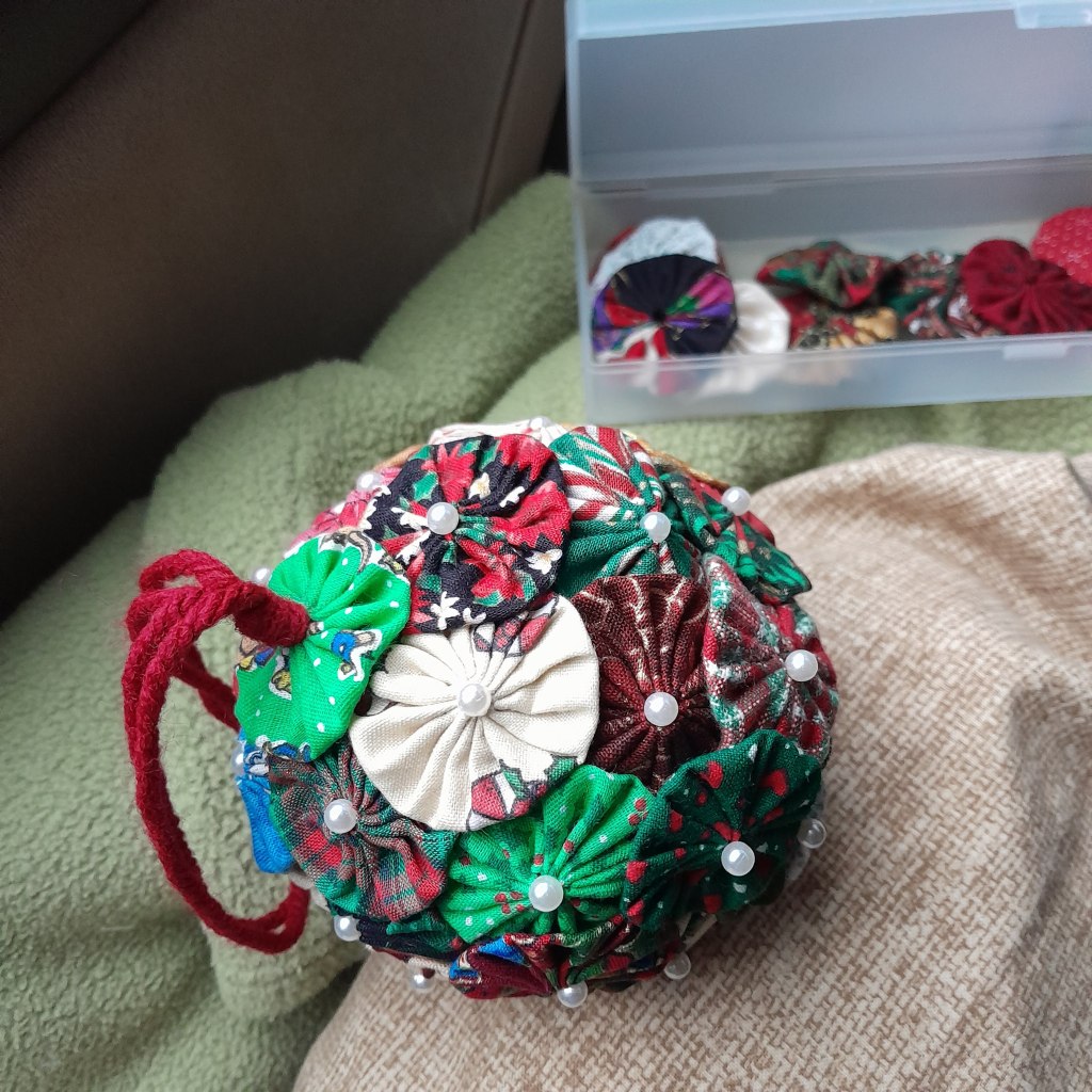 I am very pleased. There are enough yo-yos to make another ornament, but I just haven’t had a quiet moment to get to it. When the other is done, they will be tenderly wrapped in acid-free tissue and put into a “Christmas Box” in storage for when I can no longer climb over back seat of the car and have to get myself into some public housing. Fun, fun …