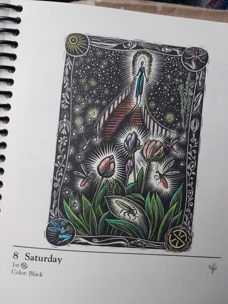 Can’t do that on the block up the hill from the Peet’s: too much foot traffic, even at 7:00 in the morning. So I keep the colored pencils on the front seat, along with the clip-board box for a lap desk, and after I finish my egg sandwich and tea, while the local Jazz station is streaming on the phone, I color for an hour. Just a little something, usually out of my Llewellyn’s Witches’ Datebook 2025. which is illustrated by some really very handsome woodcut-type prints. And for the past few months, the very simple colorizing of these has served to put me into a very pleasant state of mind. I feel quite energized, for to withstand the aggravations of the office.