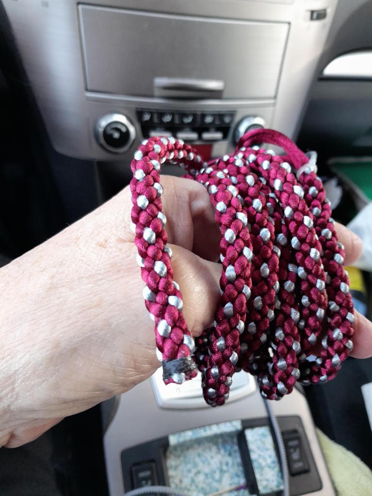 warp (as in weaving) for the time being. This here is a spiral braid. The raised edge is more raised in some places than in others, but it looks well enough. I like the flashy coloring, but have absolutely nothing to wear this with. I will put findings on it and try to sell it. And are the DOGE actually turfing people who do nothing all day? Senator Mitch McConnell pays the rent on six local offices in the State of Kentucky. Do you know there are … just … five million people in the State of Kentucky. That would be three million fewer than live in the San Francisco Bay Area, where Senators Padilla and Adam Schiff … well, actually, these two bozos will not tell me how many offices they pay rent on in the state, so there is that argument shot all to hell.