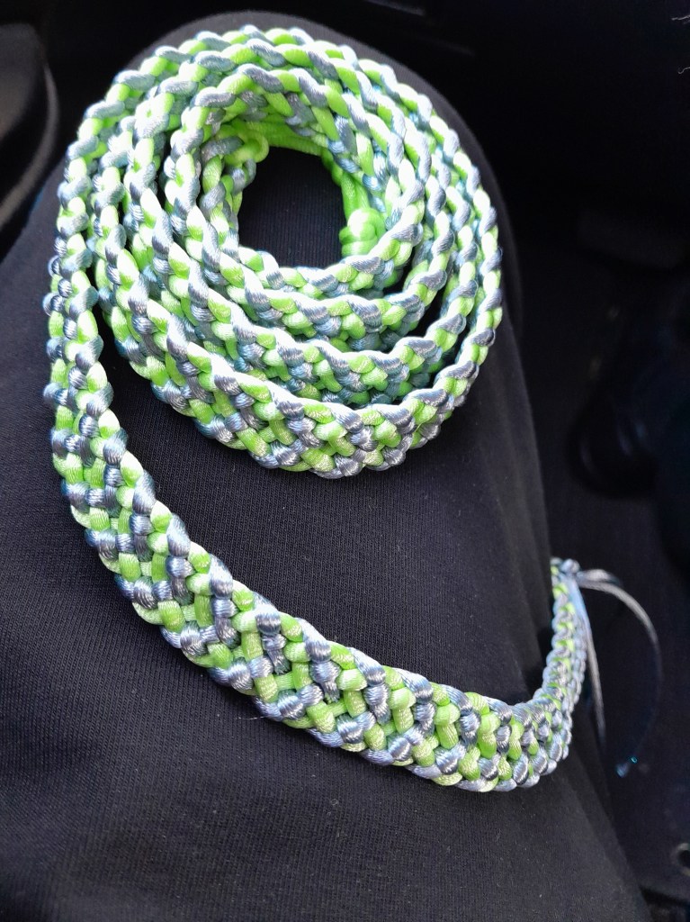 But I love the green and gray … lime green and gray. Findings … well, elegant findings for a flat braid are harder to come by … on Amazon, anyway.