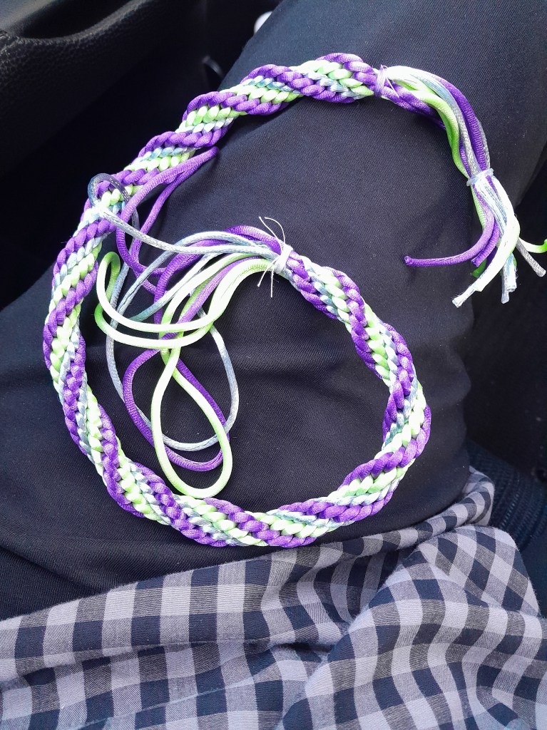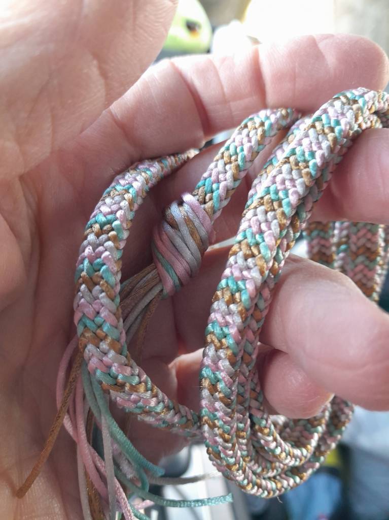 This is my first attempt at what is called the Mitake braid. But, as the Berkeley Public Library was of no use to me, I went to YouTube. And there I was instructed … apparently … wrongly. I mean, actually, do I know? And, I have to say, my photo does not show the crookedness of the braid. Well, maybe it does. Look at the section closest to my hand. The cords cross four times. Look at the third cross from the left … how short it is. The cord is essentially two braids woven together. The left braid is raised, and the right braid … owing to that third short crossing … is receded. I did spend some time trying to figure out how to tug the cords so this should not be so. No luck.