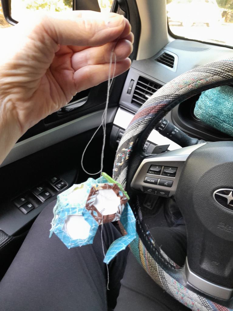 I took a car photo last Sunday, thinking to build a post around it. I was stitching hexagons together, moving on, after some months, from just the stitching of the hexies themselves. And I am already on the fourth panel of my rice bag. I like them. Stitching them together was initially daunting. The piecing of individuals into rows is no biggie, but the piecing of the rows together … all those twisty points into corners. Well, I am proficient now, and the accomplishment of a neatly stitched corner is gratifying.