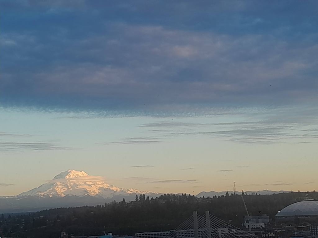 This is Mount Rainier … I’m pretty sure … seen from my hotel window in Tacoma, Washington, and on the only day it was visible during the five days I was in the room. February. It’s a very tall mountain and rather far away, and the clouds do gather round in winter.